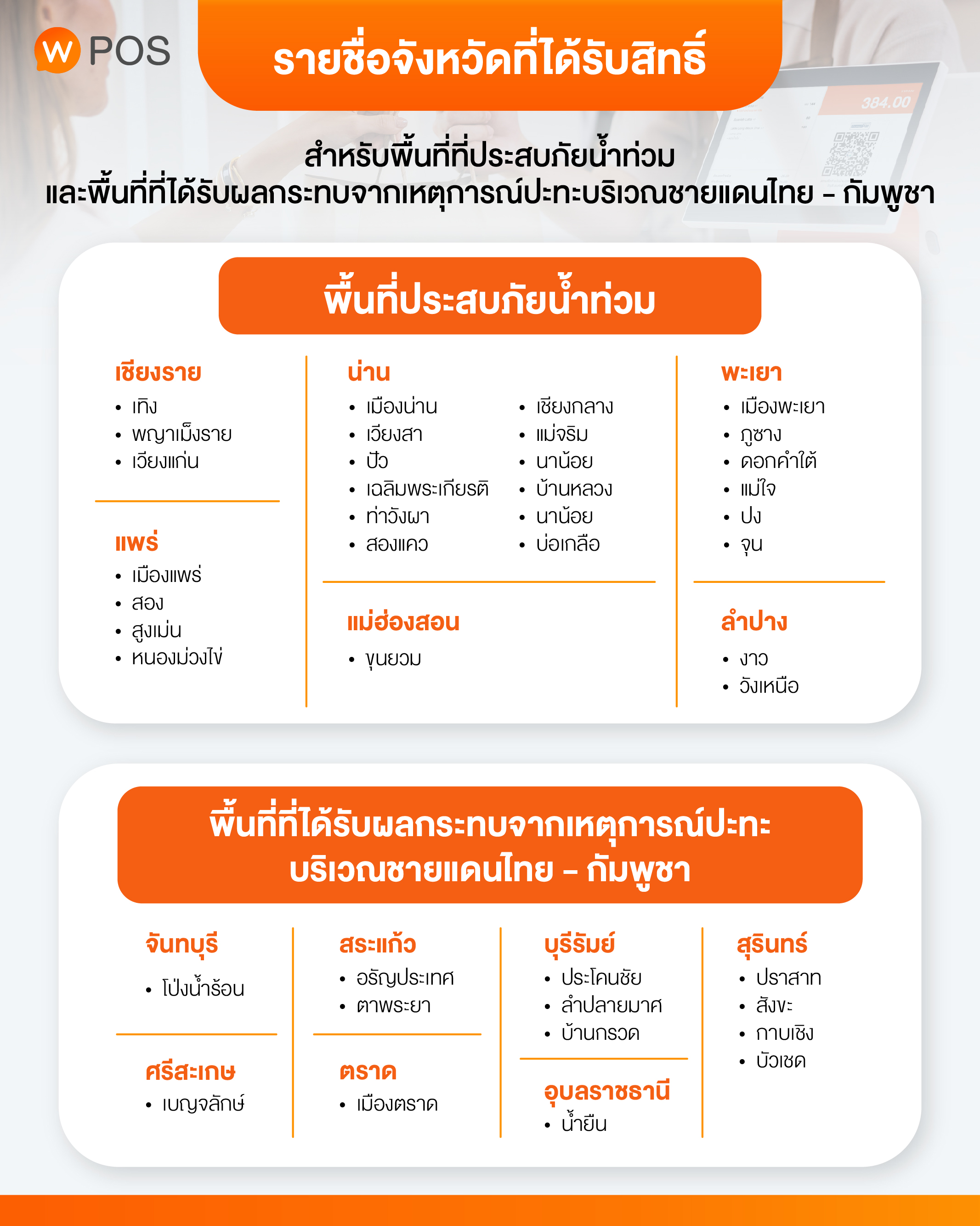 ช่วยลดค่าใช้จ่าย ให้ร้านค้าที่ประสบภัยน้ำท่วม และร้านค้าที่ได้รับผลกระทบจากเหตุการณ์ปะทะบริเวณชายแดนไทย - กัมพูชา