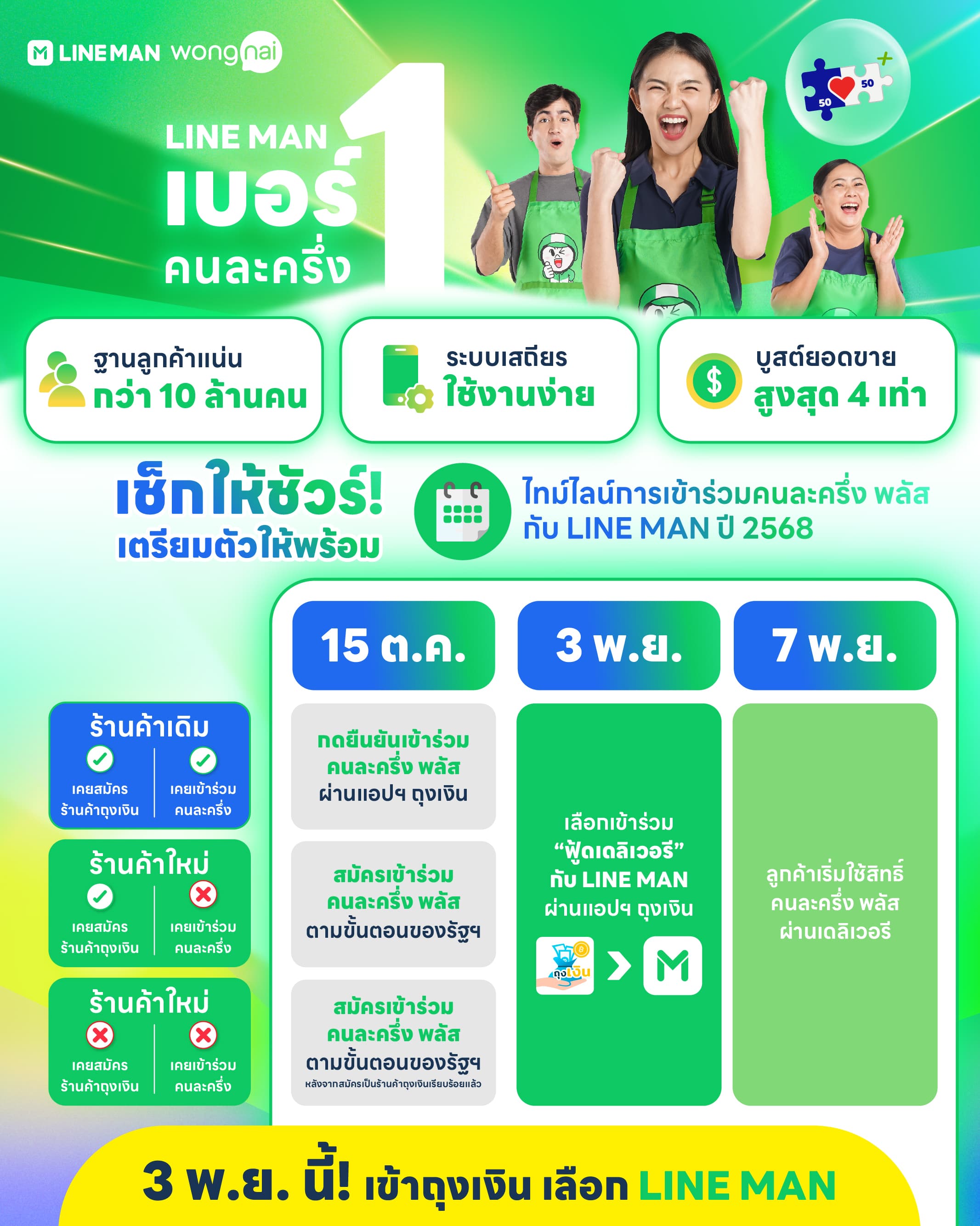 ร้านเลือกเข้าร่วมโครงการ “คนละครึ่ง พลัส” กับ LINE MAN ได้ในวันที่ 3 พ.ย. 2568 ที่แอปฯ ถุงเงิน