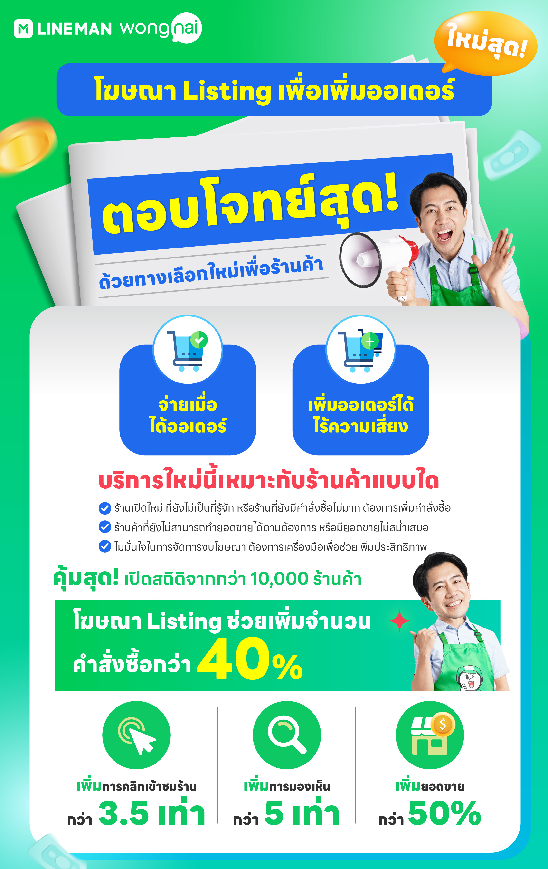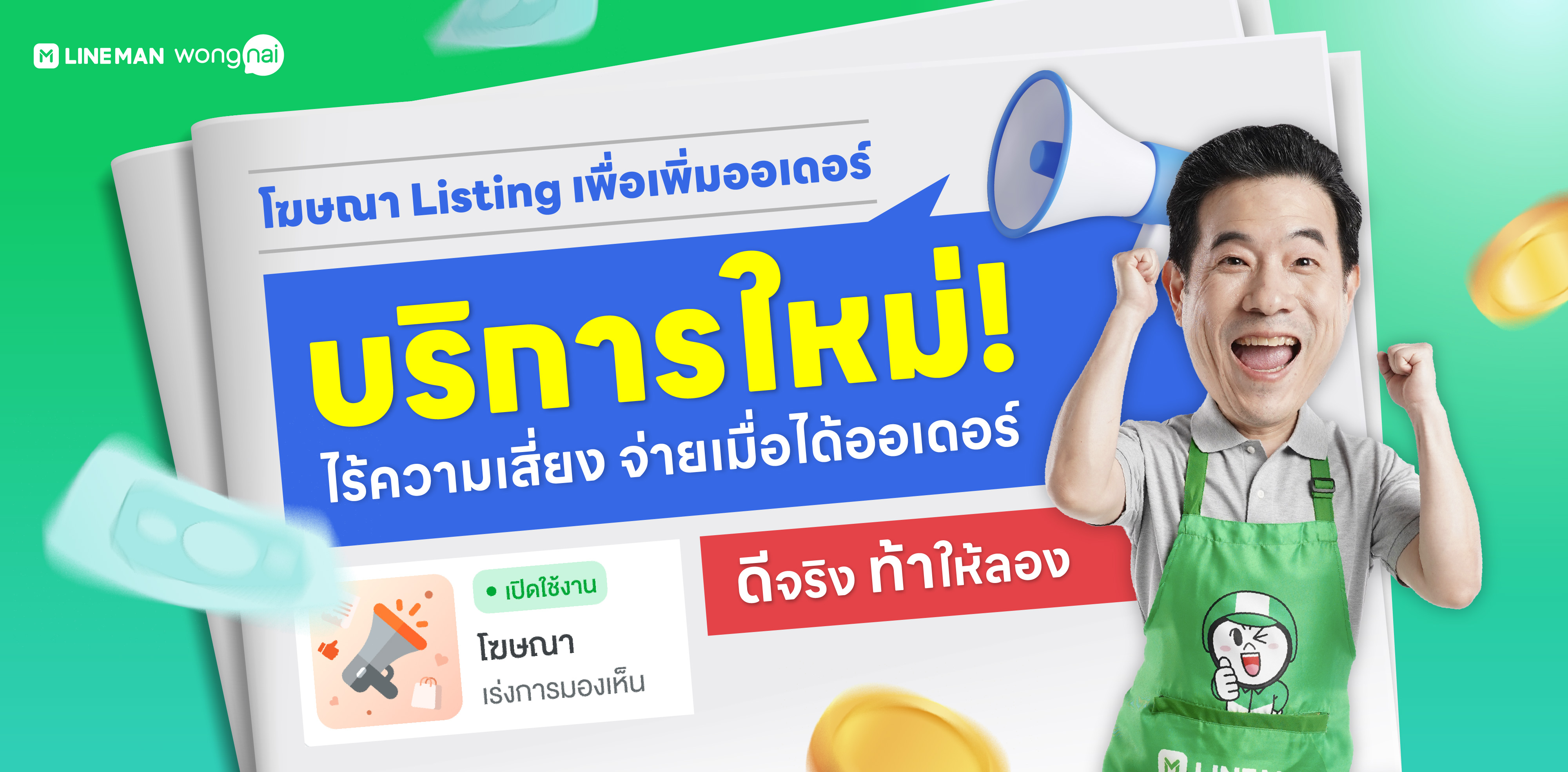 โฆษณา Listing เพื่อเพิ่มออเดอร์ เป็นโฆษณารูปแบบใหม่จาก LINE MAN ซึ่งเหมาะสำหรับร้านที่ต้องการเพิ่มออเดอร์โดยเฉพาะ โดยระบบจะคิดค่าบริการก็ต่อเมื่อ ลูกค้ากดสั่งอาหารจากโฆษณา และมีสถานะออเดอร์จัดส่งสำเร็จ