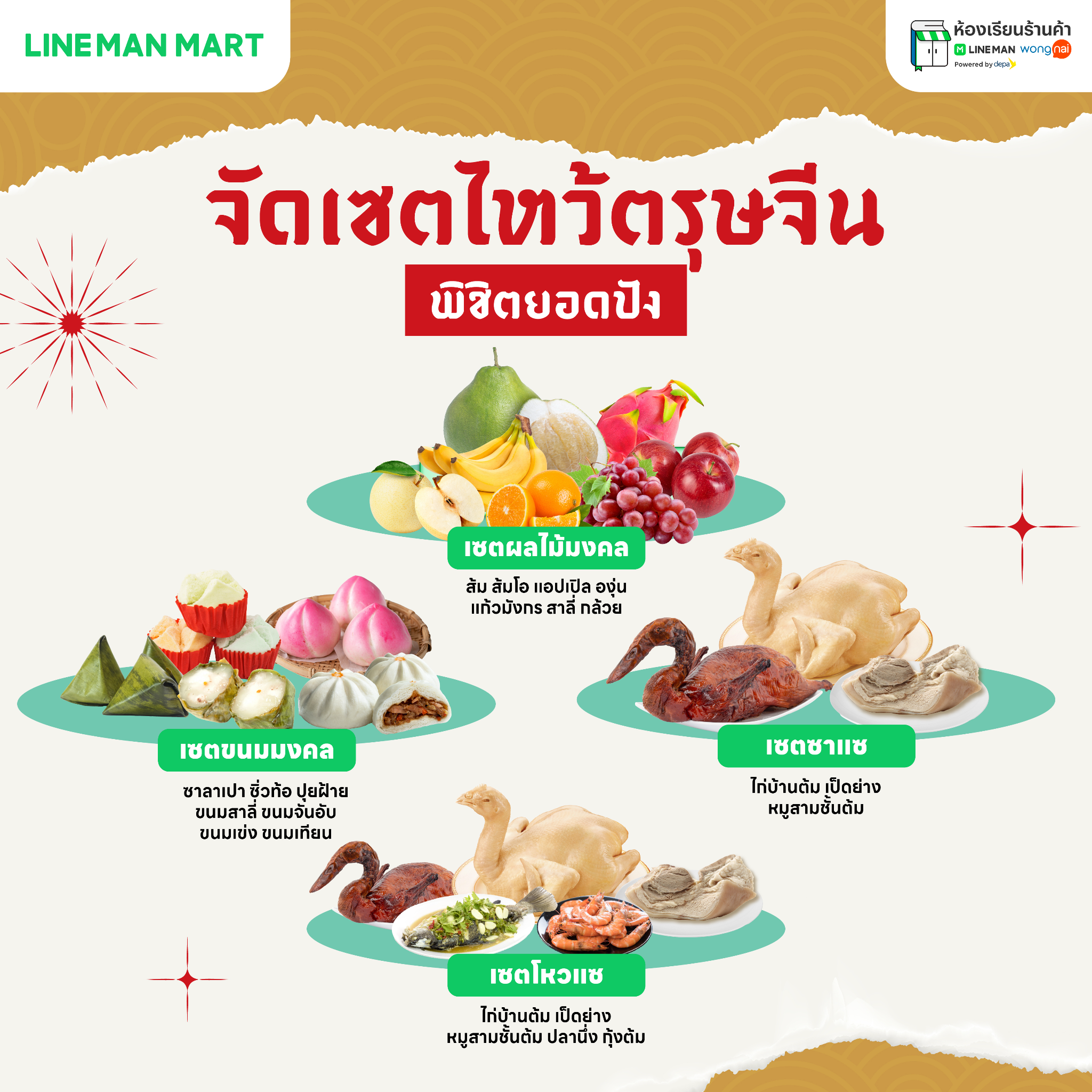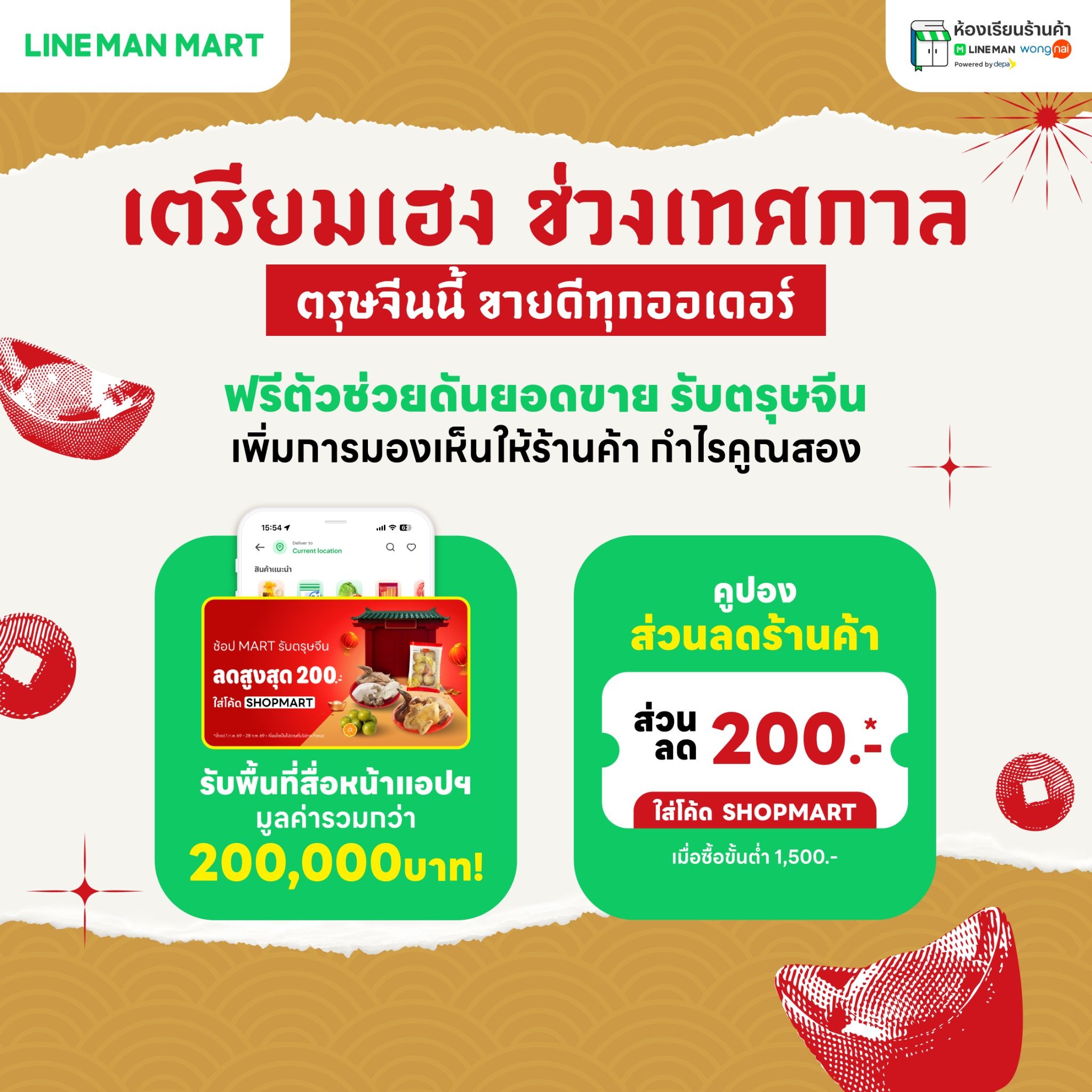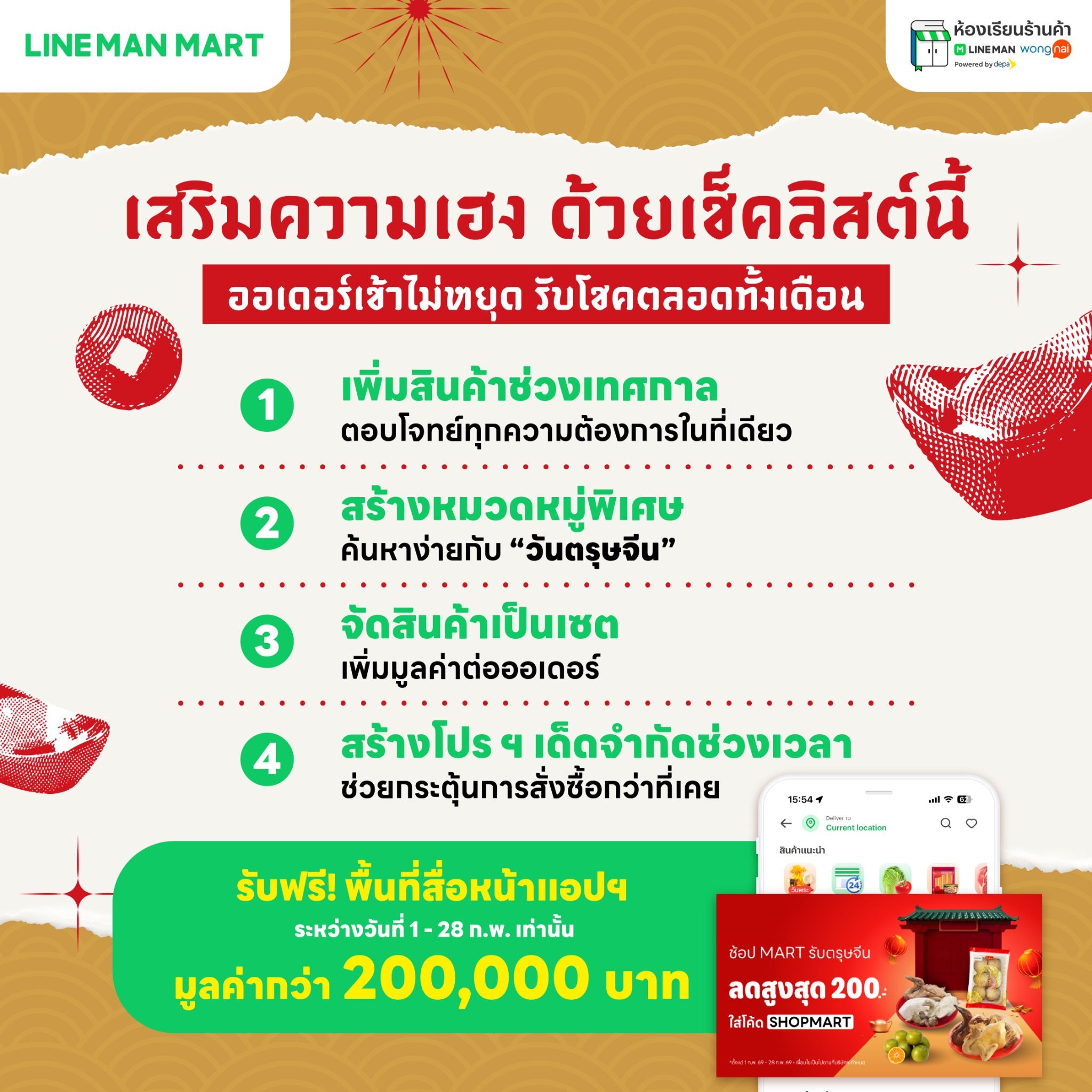 เทศกาลตรุษจีนใกล้มาถึงแล้ว โอกาสทองของร้านค้า! LINE MAN MART ชวนพ่อค้าเเม่ค้ามาปั้นยอดขาย แค่จัดเซตสินค้ามงคล จัดหมวดชัดเจน และจัดโปรจำกัดเวลา คุณก็มีโอกาสเห็นออเดอร์พุ่งขึ้นทันใจ พร้อมรับสิทธิพิเศษจากแพลตฟอร์มที่ร่วมโปร