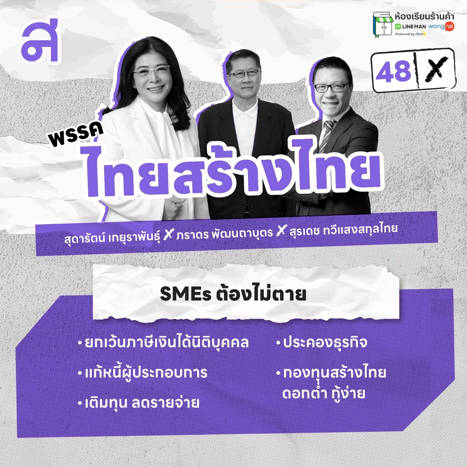 การเลือกตั้งปีนี้ จึงไม่ใช่เรื่องไกลตัวของผู้ประกอบการร้านอาหารและ SMEs เพราะ “นโยบายรัฐ” มีผลกับกำไรของร้านมากกว่าที่หลายคนคิดวันนี้ LINE MAN สรุปนโยบายของแต่ละพรรค เฉพาะมุมที่เกี่ยวข้องกับ ร้านอาหารและ SMEs