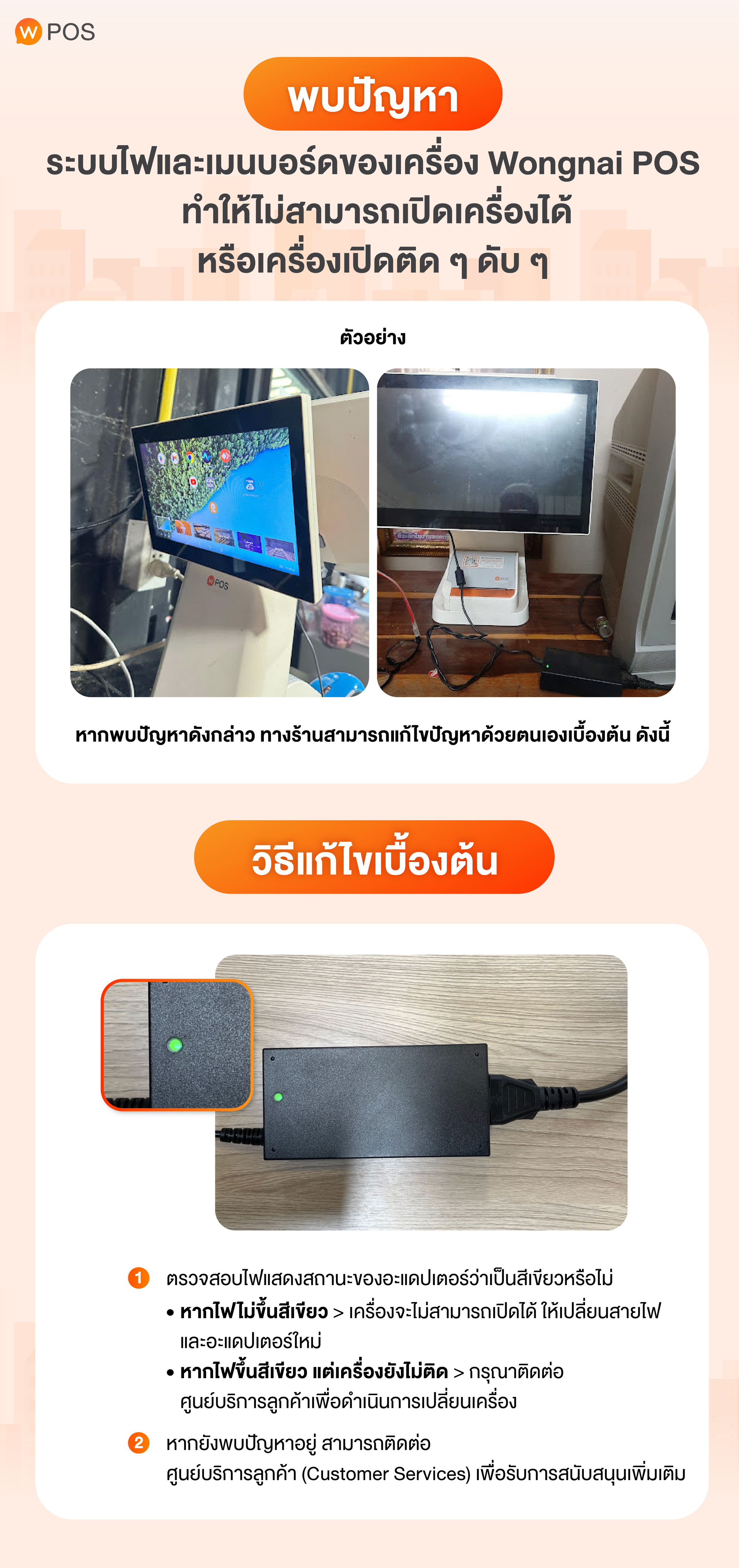 พบปัญหา : ระบบไฟและเมนบอร์ดของเครื่อง Wongnai POS ทำให้ไม่สามารถเปิดเครื่องได้ หรือเครื่องเปิดติด ๆ ดับ ๆ
