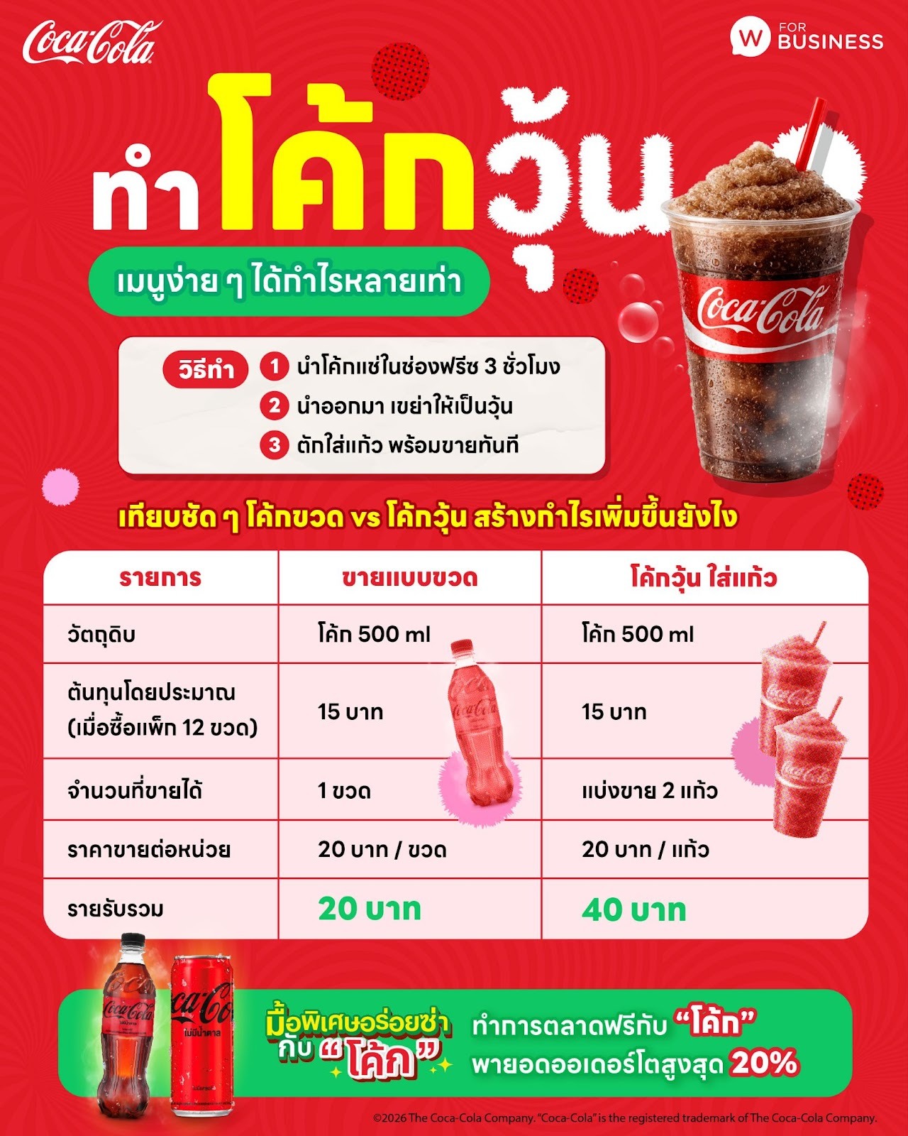 หน้าร้อนมาแล้ว ลูกค้าเริ่มจะมองหาอะไรที่ เย็น และสดชื่น มากกว่าเครื่องดื่มธรรมดา หนึ่งในเมนูที่ร้านค้าหลายร้านเริ่มทำขายคือ “โค้กวุ้น” เครื่องดื่มโค้กกึ่งน้ำ กึ่งเกล็ดน้ำแข็ง ที่ให้ความเย็นสดชื่นมากกว่าโค้กปกติ แต่ทำได้ง่าย ใช้แค่ช่องฟรีซ จากโค้กที่เคยขายเป็นขวด สามารถเปลี่ยนเป็นเมนูหน้าร้อนที่ขายได้ง่าย และเพิ่มมูลค่าได้ทันที