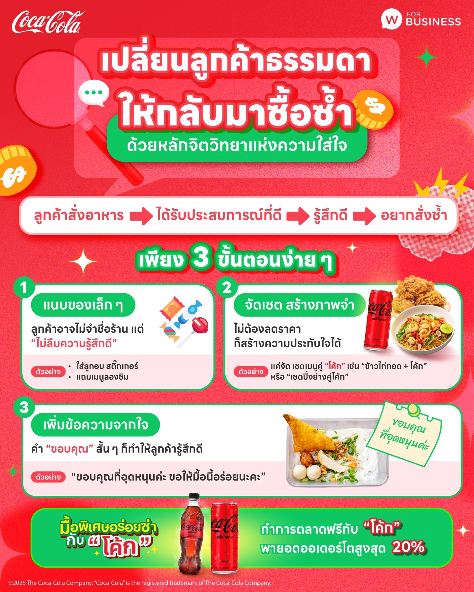 อยากให้ร้านของคุณปังสุด ๆ ต้องร่วมแคมเปญ มื้อพิเศษอร่อยซ่าไปกับ “โค้ก” เพิ่มยอดขายง่าย ๆ ด้วยการ จัดโปรโมชั่นในเวลาทอง พร้อมเพิ่ม “โค้ก” เข้าไปในเซต เพื่อเพิ่มความสดชื่นในมื้ออาหาร และกระตุ้นให้ลูกค้าตัดสินใจซื้อง่ายขึ้น การันตีว่าลูกค้าจะกลับมาซื้อซ้ำเพิ่มยอดขายได้อย่างต่อเนื่อง พร้อมช่วยเพิ่มกำไรให้ร้านคุณเติบโตไปอย่างมั่นคง!