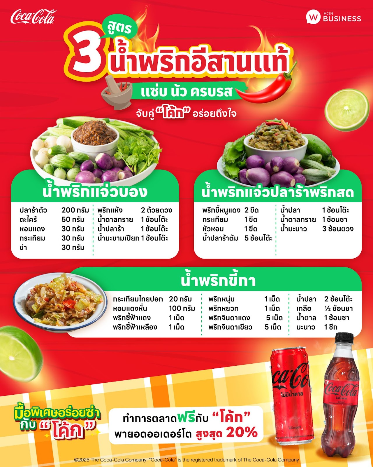 น้ำพริกอีสานไม่ได้มีดีแค่ความอร่อย แต่ยังเป็น เมนูทำง่าย ต้นทุนต่ำ และต่อยอดขายได้จริง เพราะสามารถเสิร์ฟเป็นจานหลัก เครื่องเคียง หรือทำเป็นเซตจับคู่กับเครื่องดื่มอย่าง “โค้ก” ก็ช่วยเพิ่มความคุ้มค่า และดึงดูดลูกค้าให้สั่งมากขึ้น