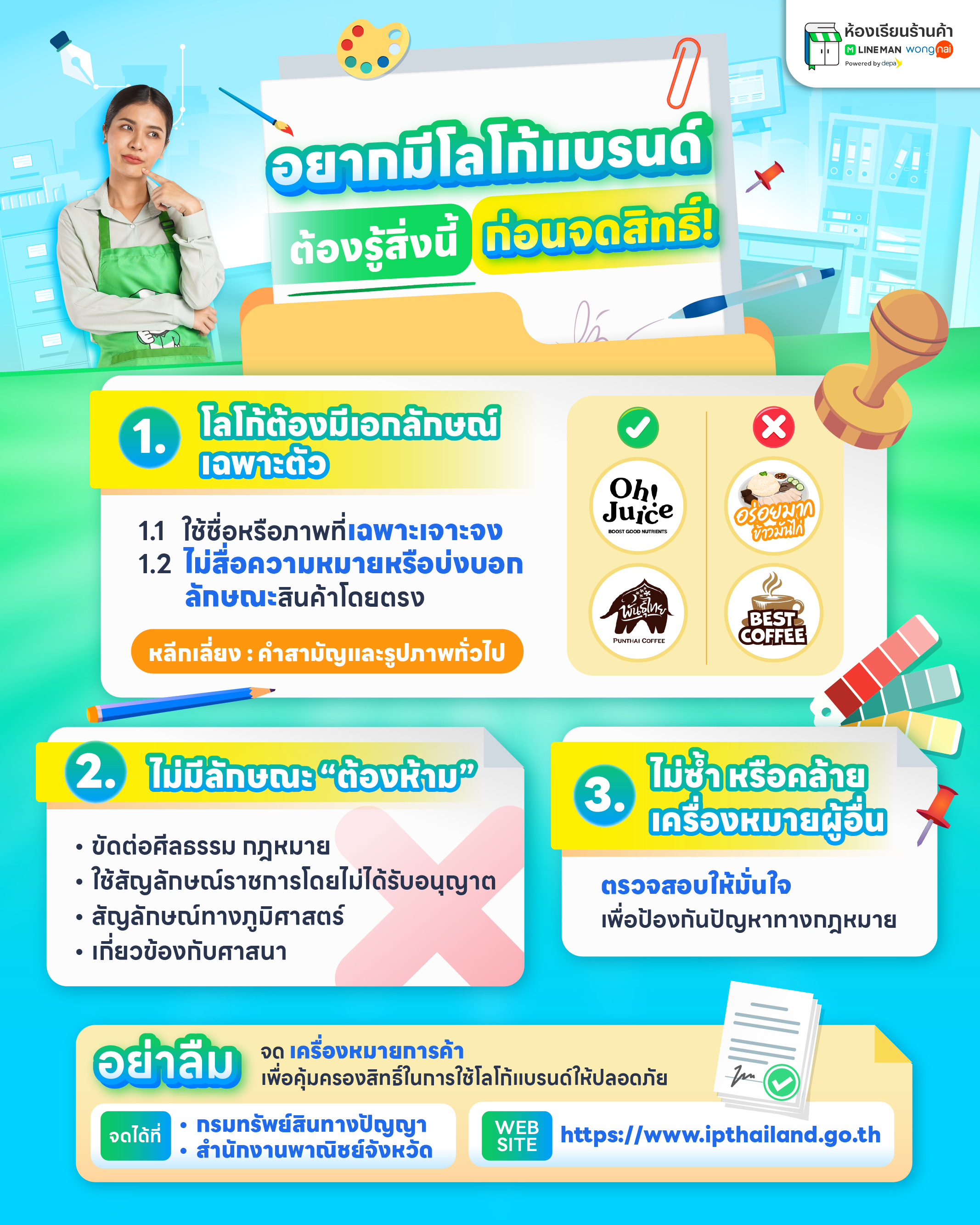 อย่างไรก็ตาม เจ้าของร้านจำนวนไม่น้อย ละเลยขั้นตอนสำคัญหลังจากออกแบบโลโก้ นั่นคือ “การจดทะเบียนเครื่องหมายการค้า” ซึ่งหากไม่จดสิทธิ์ไว้แต่แรก ต่อให้ทางร้านเป็นคนคิด ออกแบบ หรือใช้โลโก้นั้นมาก่อน ก็ไม่สามารถป้องกันไม่ให้ผู้อื่นนำไปใช้ได้ และเมื่อมีปัญหาเกิดขึ้น เช่น มีร้านอื่นใช้โลโก้คล้ายกัน หรือเปิดแฟรนไชส์โดยไม่ได้รับอนุญาต ร้านก็จะ ไม่มีสิทธิ์ฟ้องร้อง หรือเรียกร้องความเสียหายได้ตามกฎหมาย