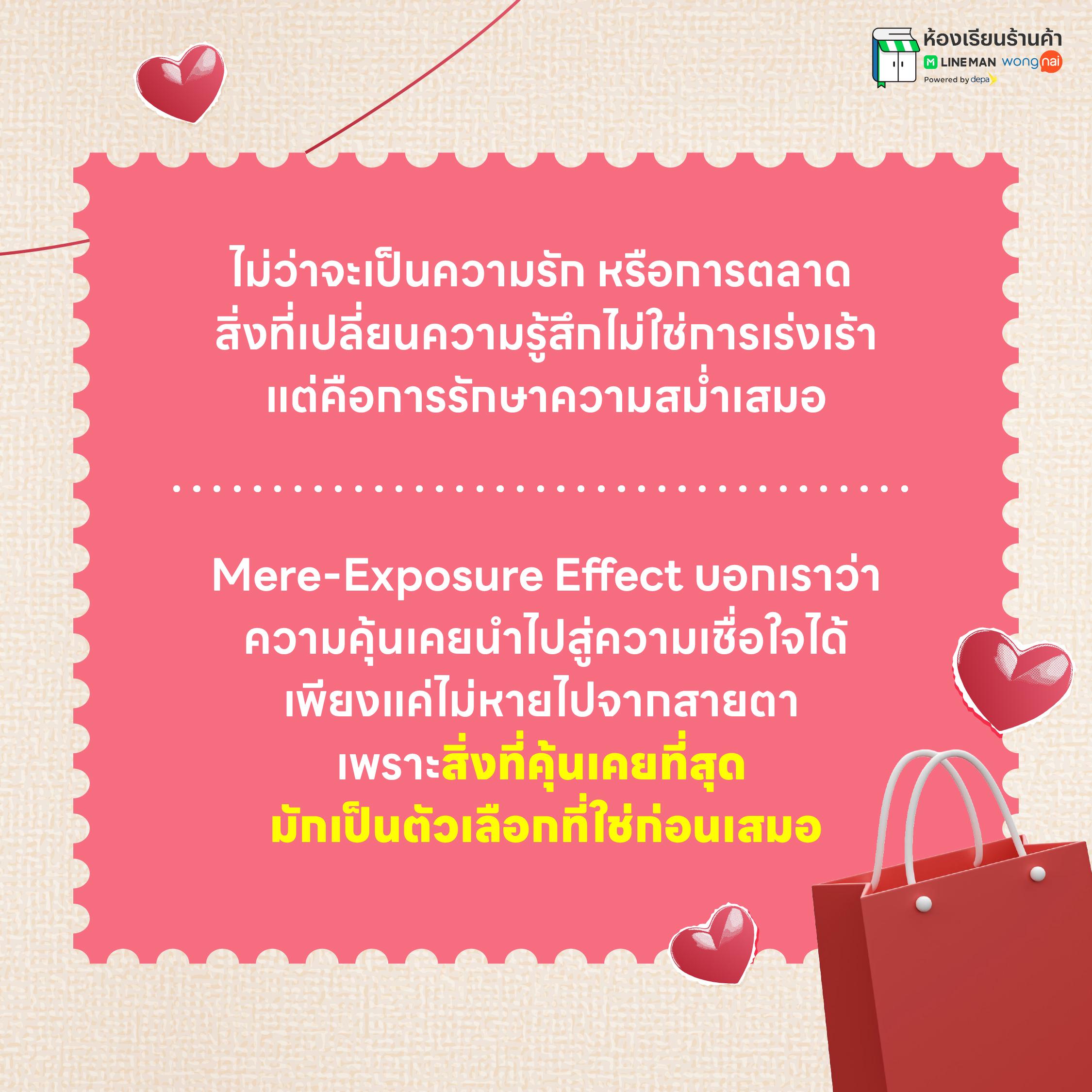 ท้ายที่สุดแล้ว ไม่ว่าจะเป็นความรัก หรือการตลาด สิ่งที่ทำให้ความรู้สึกเปลี่ยนไปไม่ใช่ความพยายามที่เร่งเร้า แต่คือการปรากฏตัวอย่างสม่ำเสมอ และจริงใจ Mere-Exposure Effect สอนให้เรารู้ว่า ความคุ้นเคยคือสะพานที่เชื่อมไปสู่ความเชื่อใจ และต่อยอดเป็นการตัดสินใจได้ ในวันที่ลูกค้ายังไม่พร้อม แบรนด์ไม่จำเป็นต้องรีบปิดการขาย แต่อย่าหายไปจากสายตา เพราะเมื่อถึงจังหวะที่ต้องเลือก ในบรรดาคู่แข่งทางธุรกิจมากมาย ตัวเลือกที่คุ้นเคยที่สุด มักเป็นตัวเลือกที่ใช่ก่อนเสมอ